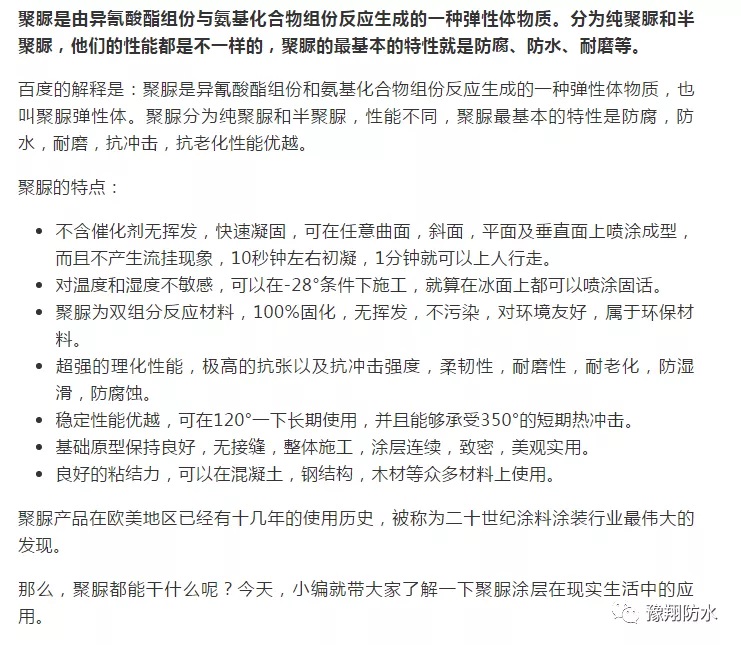 聚脲材料的防水性能非常優越,噴涂后的聚脲形成一個整體類似橡膠層一樣的整體防水層,所以,水分根本進不去。
