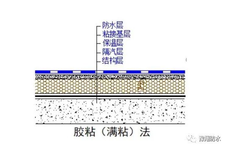 粘接法不難理解,施工時(shí)在卷材及基面上涂刷膠粘劑,通過膠粘劑將卷材粘接固定與基面之上。此施工方法常用于一些混凝土結(jié)構(gòu)層的防水施工。粘接法可分為滿粘法,條粘法、點(diǎn)粘法則是在局部條形、點(diǎn)狀區(qū)域涂刷膠粘劑來進(jìn)行卷材的粘接施工;